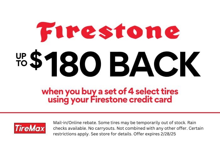 Mail-in/Online rebate. Some tires may be temporarily out of stock. Rain checks available. No carryouts. Not combined with any other offer. Certain restrictions apply. See store for details. Offer expires 2/28/25